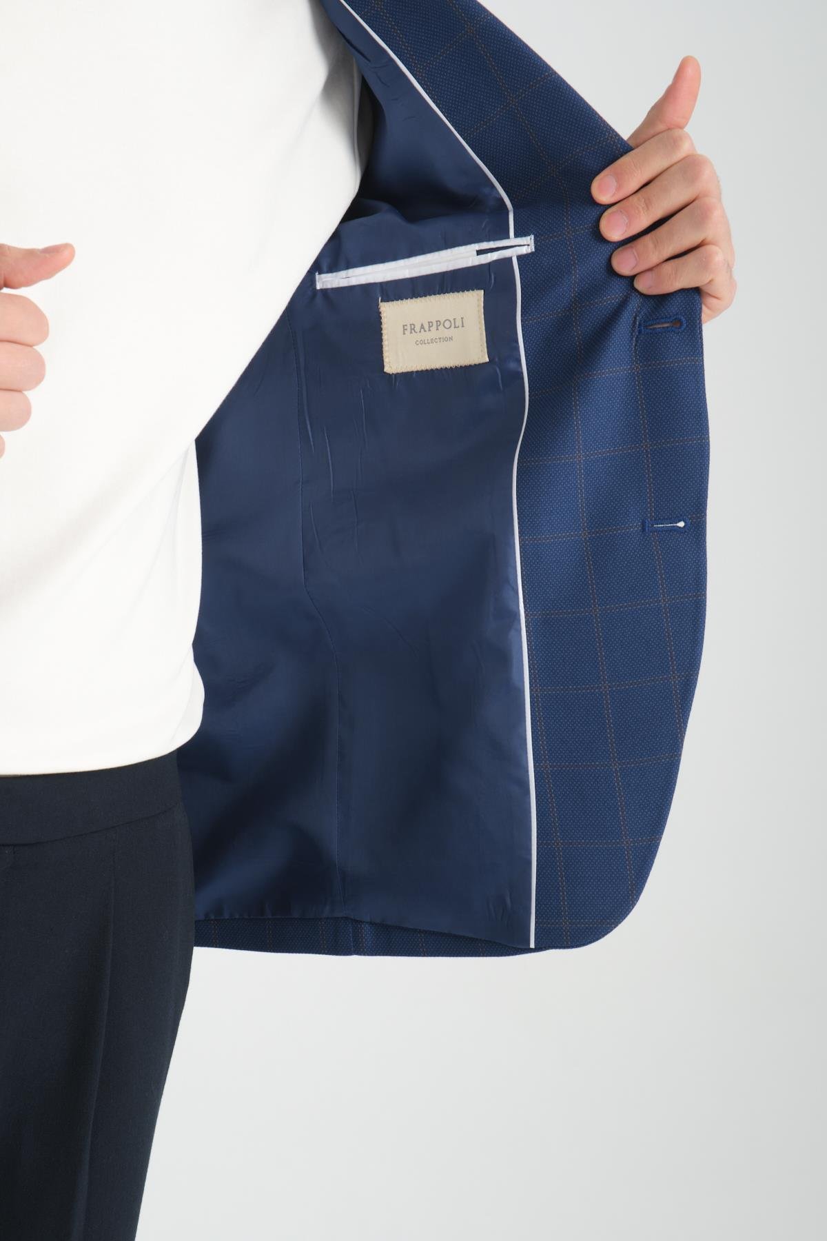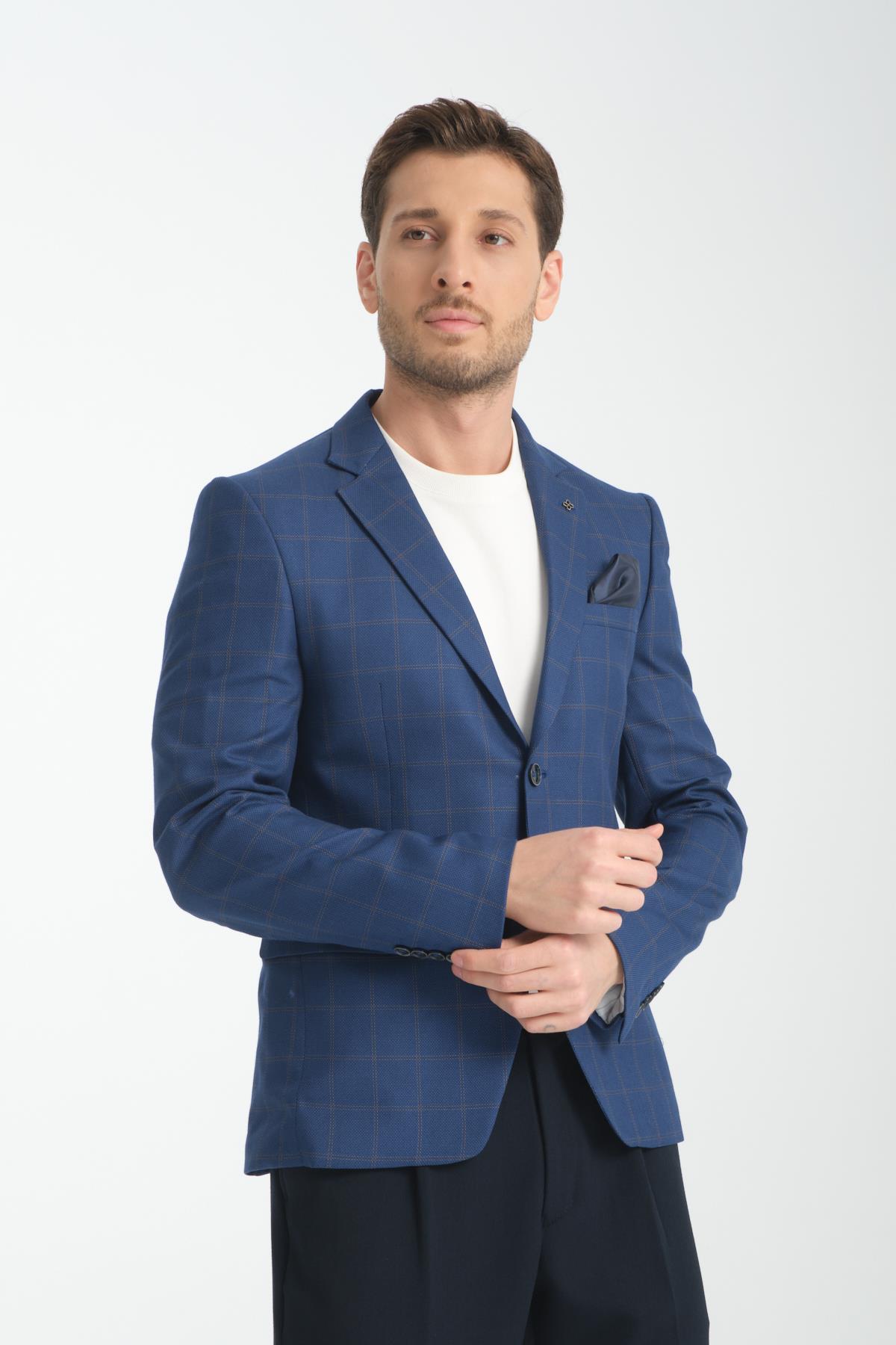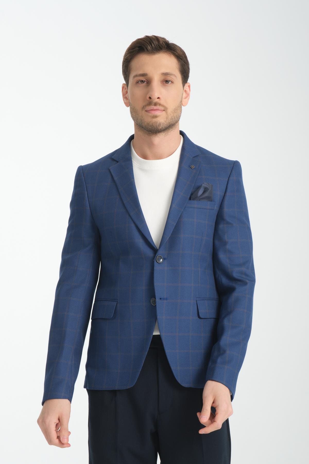 Armando Erkek Lacivert-Bej Ekoseli Slim Fit Dar Kesim Mono Yaka Spor Blazer Ceket