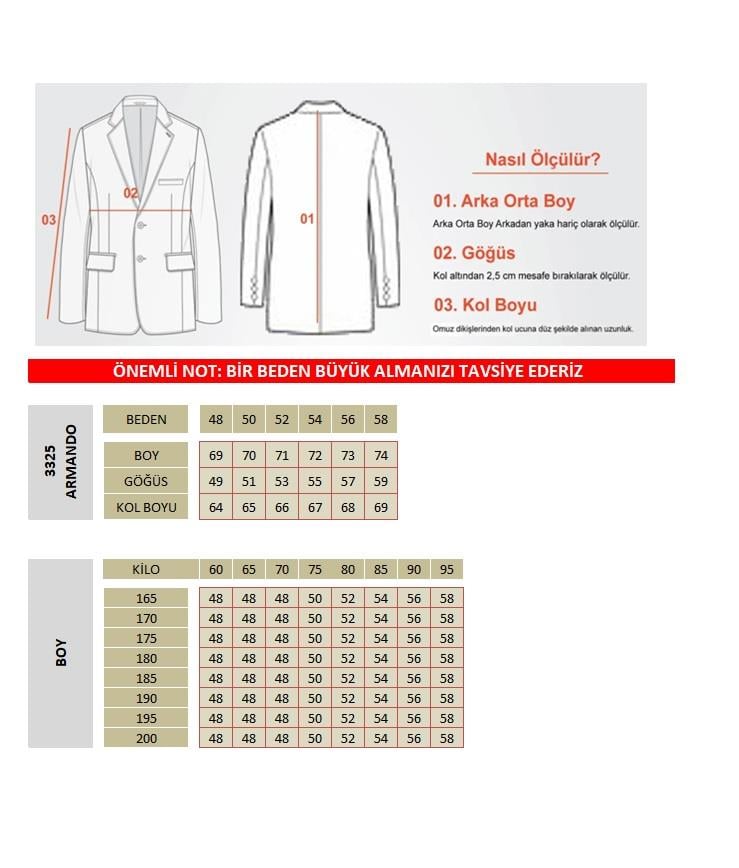 ÖNEMLİ NOT: BİR BEDEN BÜYÜK ALMANIZI TAVSİYE EDERİZ! MANKEN BOYU:1.87 KİLO:83 ÜZERİNDEKİ CEKET 52 BEDENDİR!