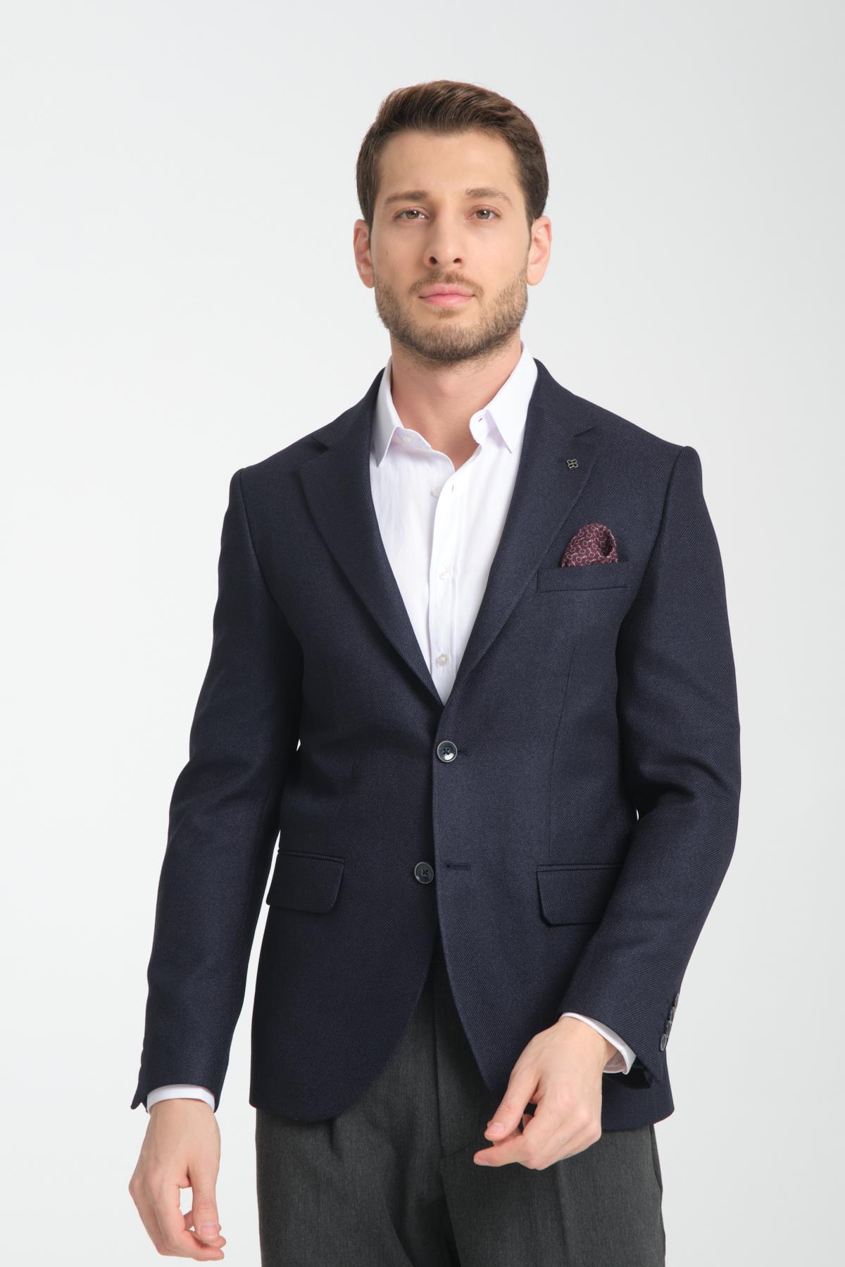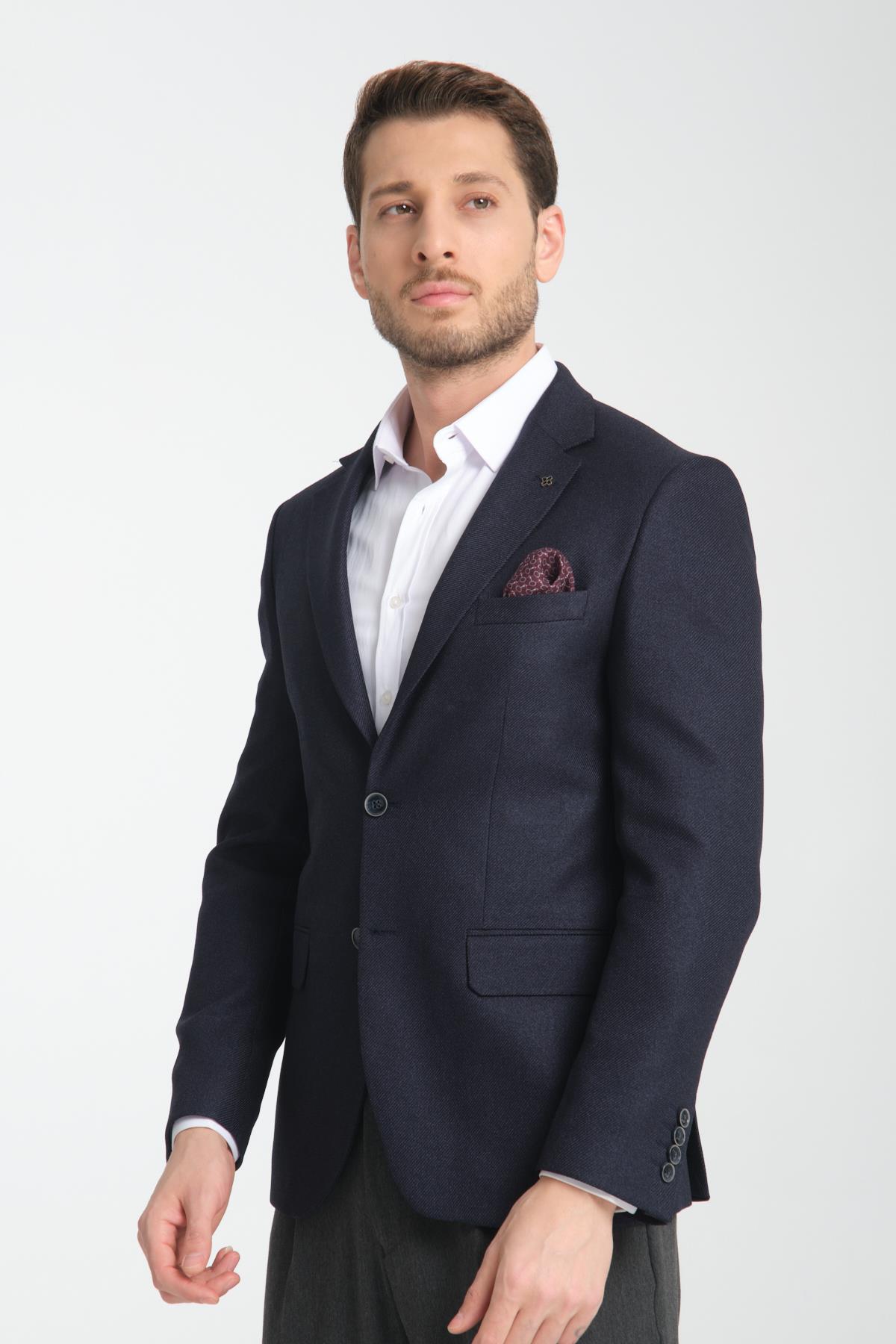 Fevual Erkek Koyu Lacivert Mono Yaka Diagonal Desenli Slim Fit Spor Blazer Ceket