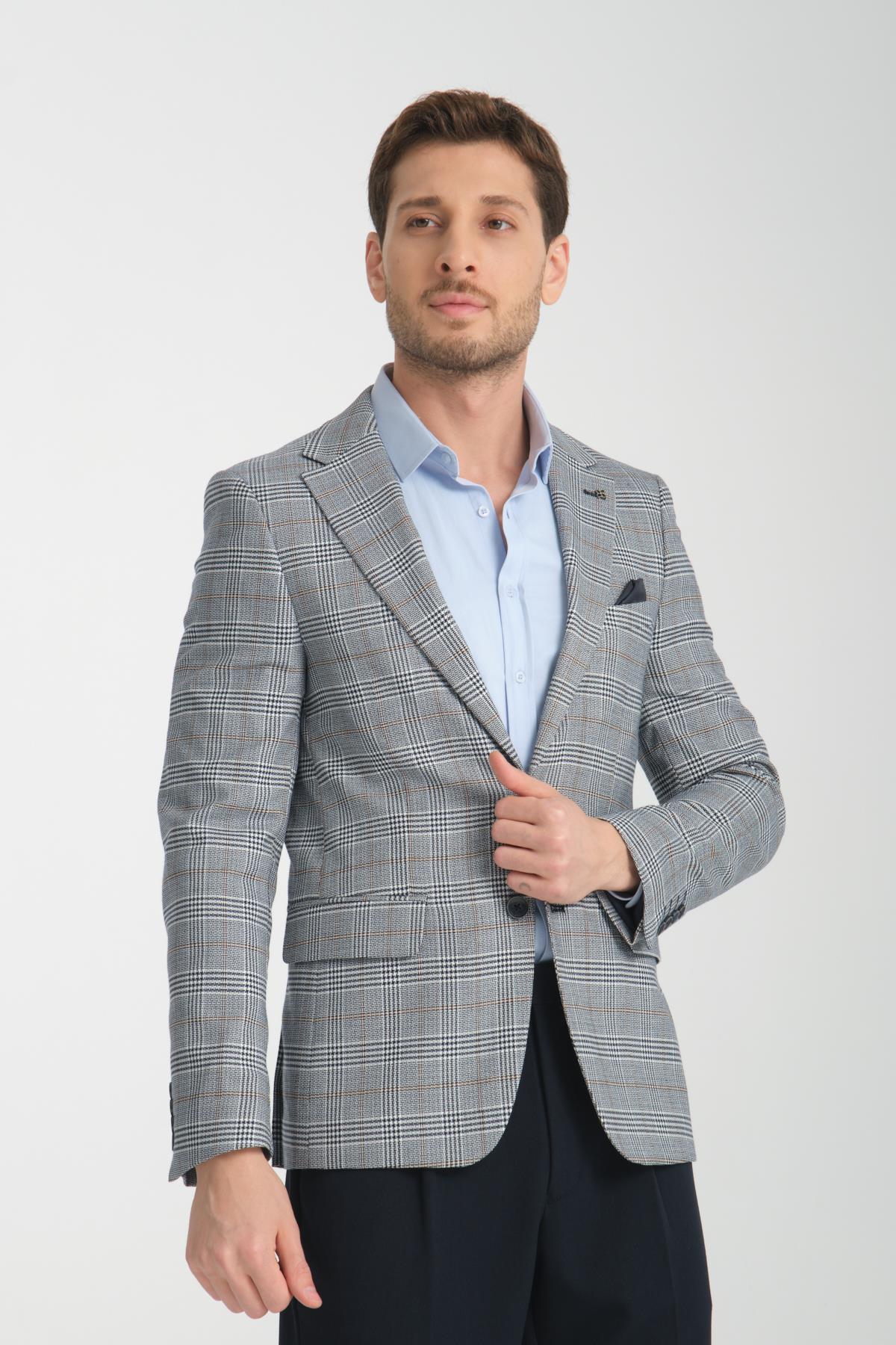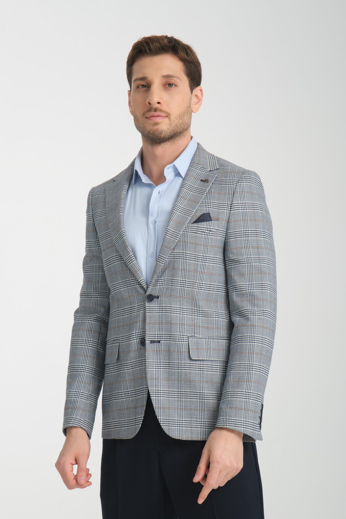 Manio Erkek Koyu Lacivert Ekose Slim Fit Mono Yaka Spor Blazer Ceket