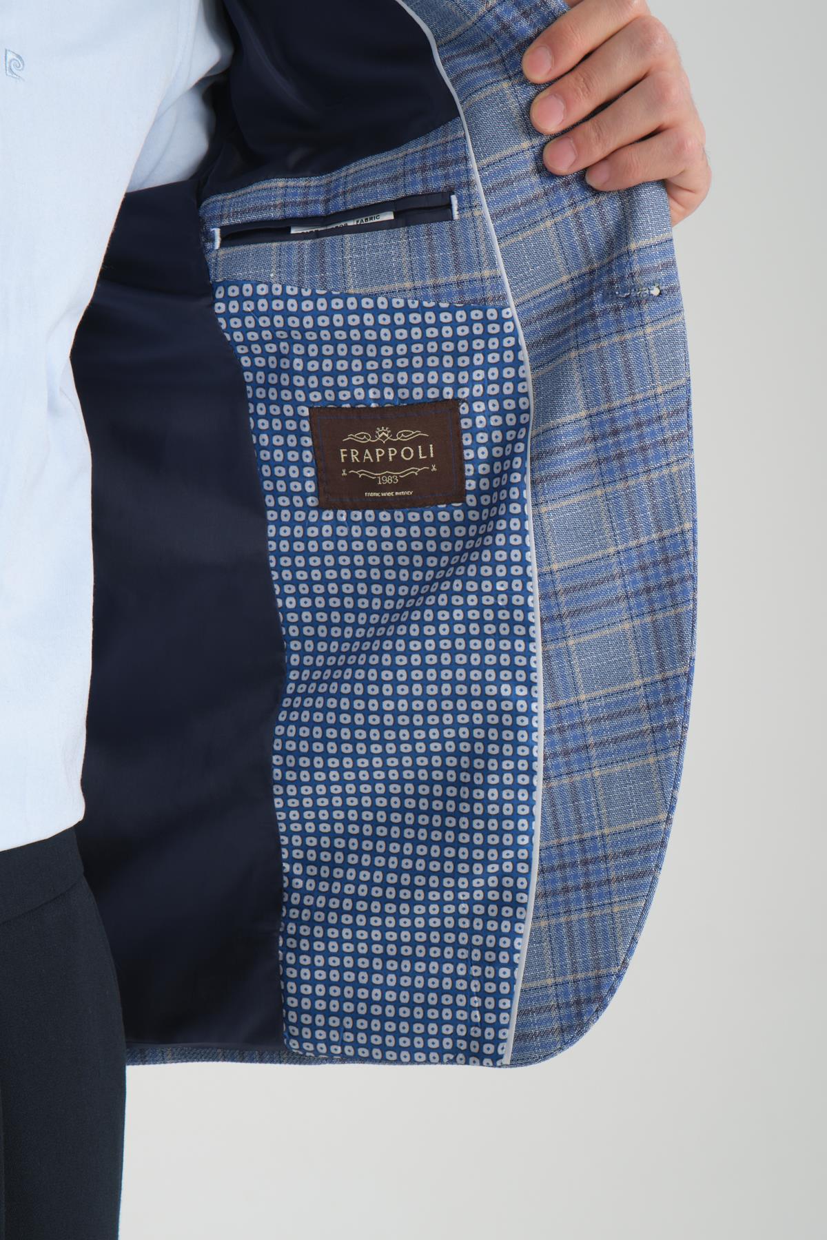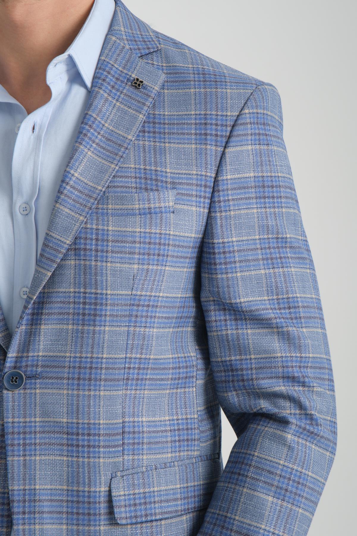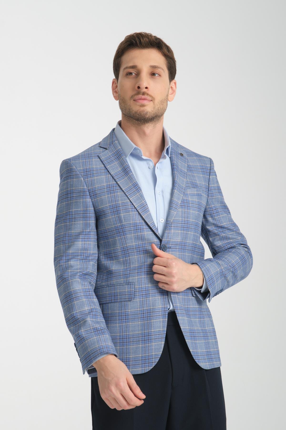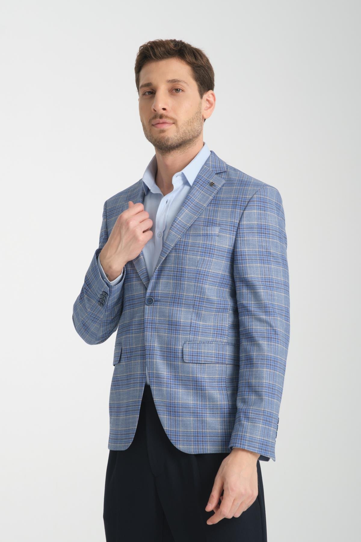 Uche Erkek İndigo Ekose Desenli Slim Fit Mono Yaka Blazer Ceket